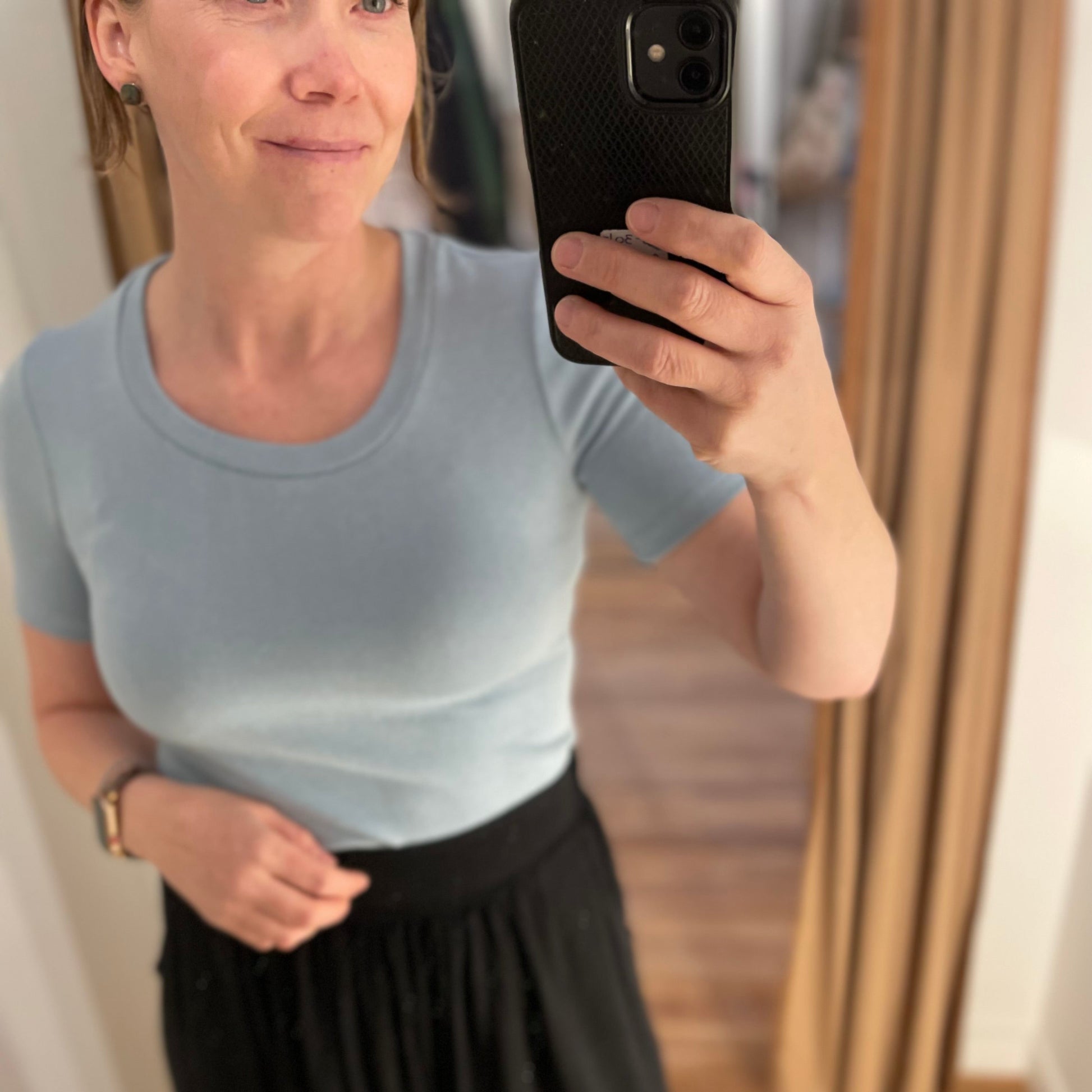 A refined short-sleeve top with a soft, fluid drape.