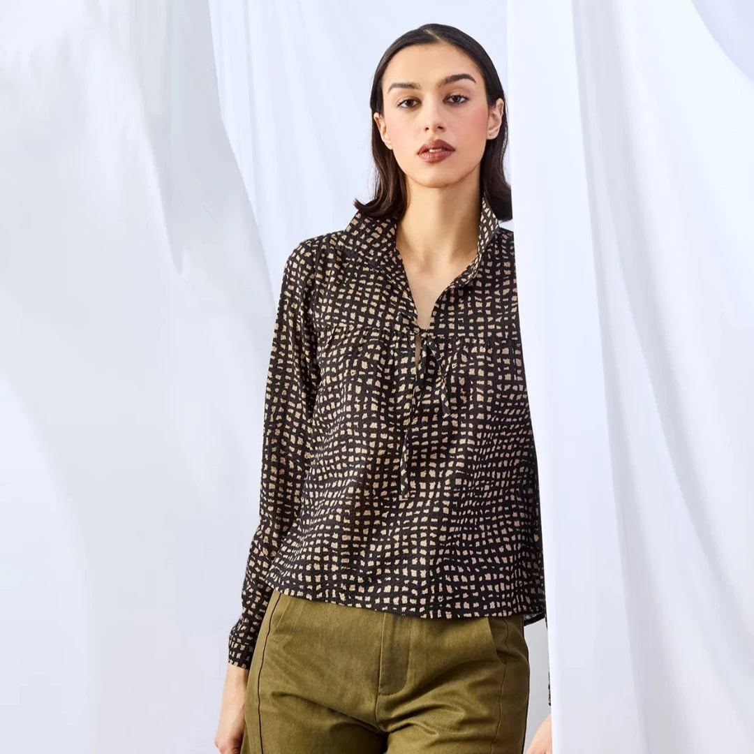 Amazing dream weave cotton pop over blouse. Tie front split neckline with the option to button at the collar which can be worn up or down. Front and back gathered yokes. Full length sleeves tucked into cuffs at the hem.
