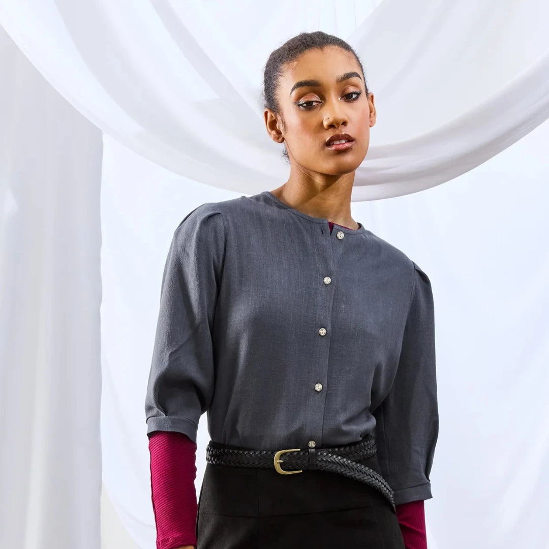 Wonderfully relaxed fit viscose linen button up. Crew shape rounded neckline. Tucks in the cap and at the hem of the sleeve, finished with cuffs. Hem curves up at the sides slightly.