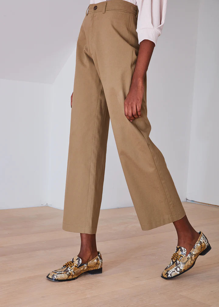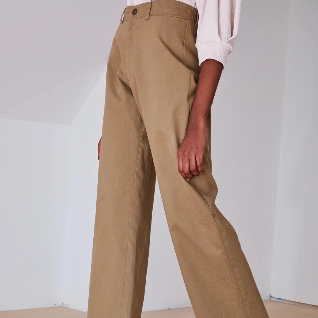 High waisted straight leg pant in sanded cotton twill. Front slash pockets. Elasticized back waistband for an easy fit. Fly front zipper closure. Sustainable coconut button.