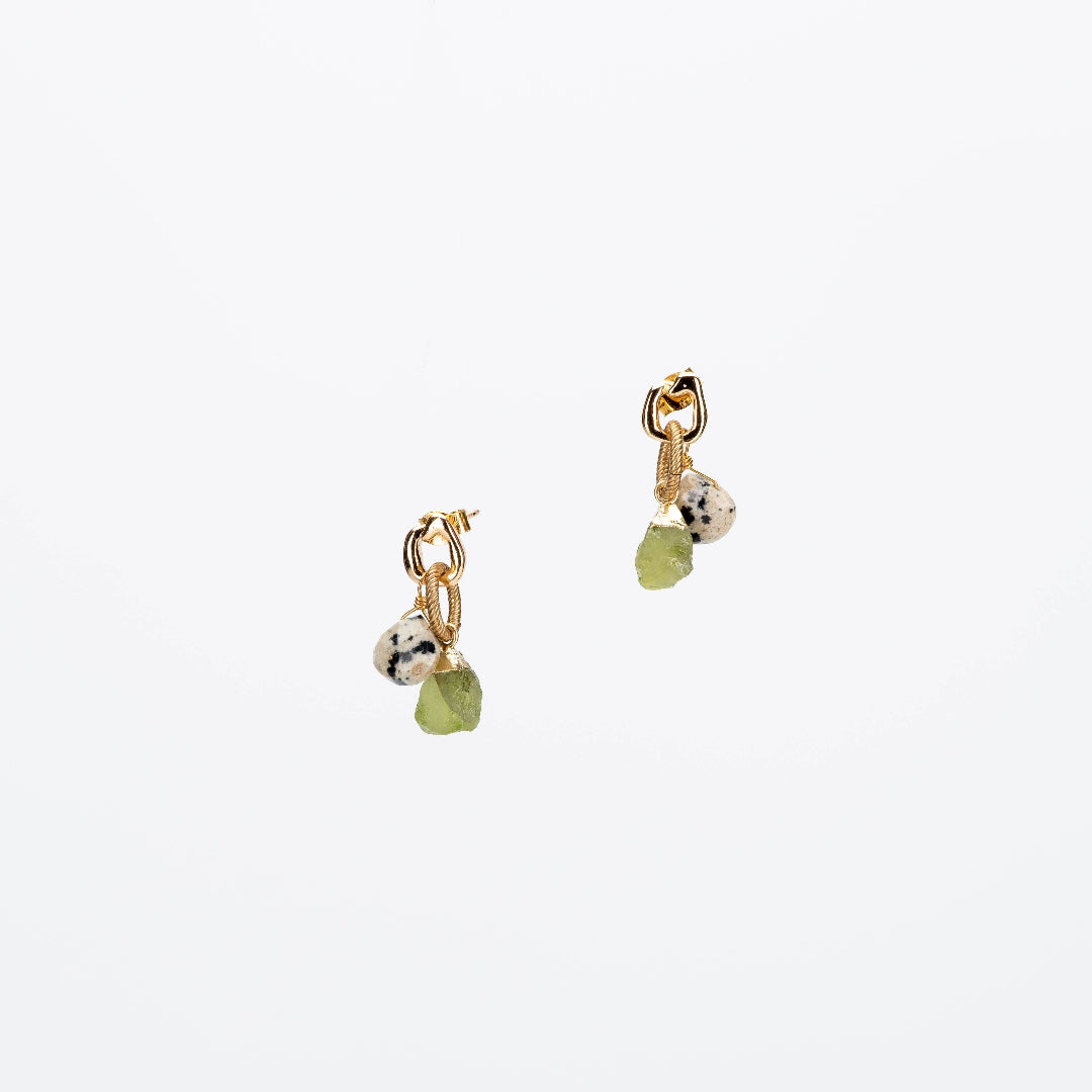 Crafted with hand-cut Dalmation Jasper and rough-cut Peridot, these earrings are a must-have. The elegant gold hoops add a touch of refinement while the textured brass ring adds contrast and and interest. Hot tip: we love it styled in a second or third piercing to build an ear stack with your other faves from the collection (see model pic).