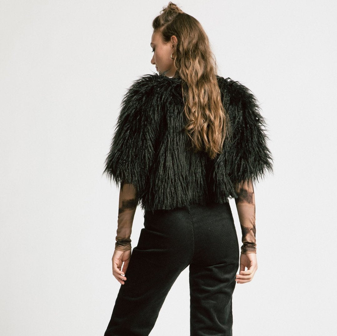 A fun topper made from shaggy faux fur. Wear it over literally anything.